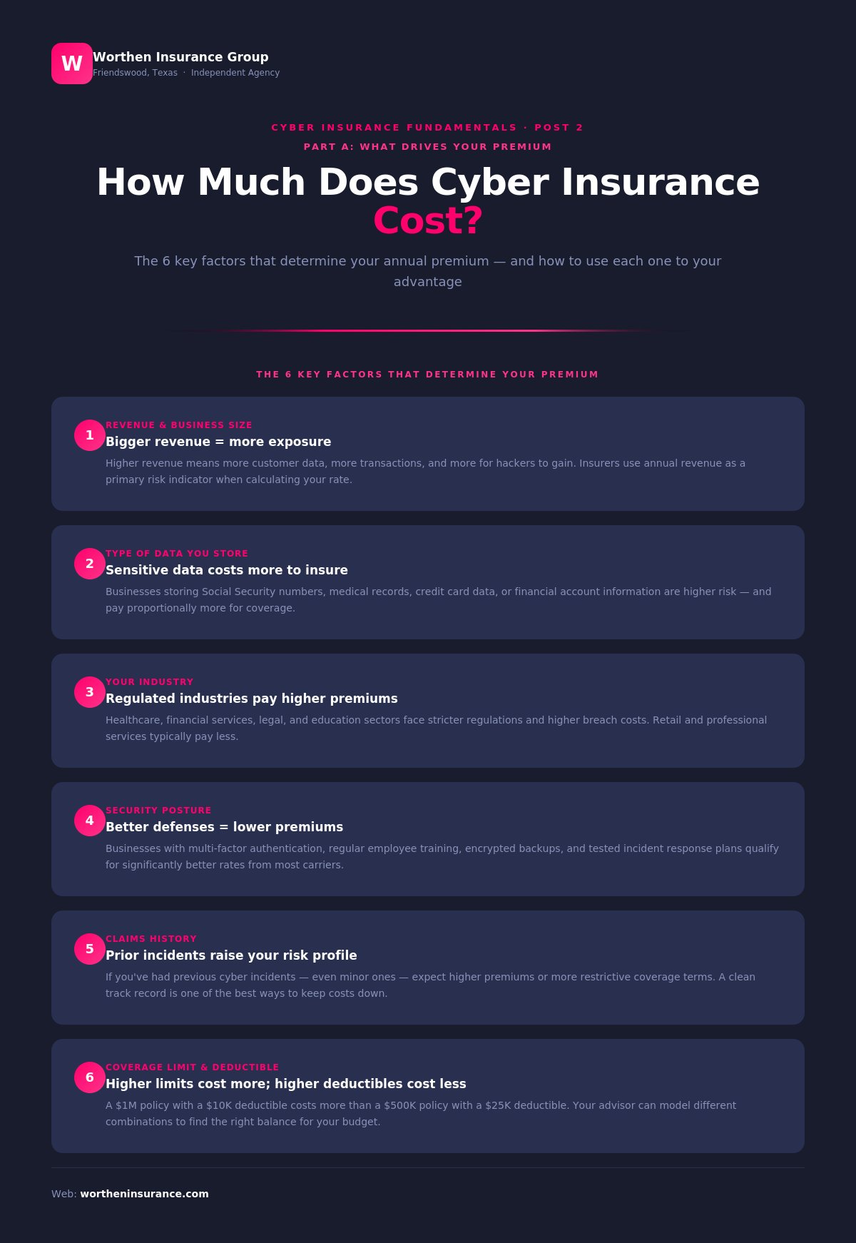 The more personal or financial records you store, the bigger the potential breach — and the higher your rate.