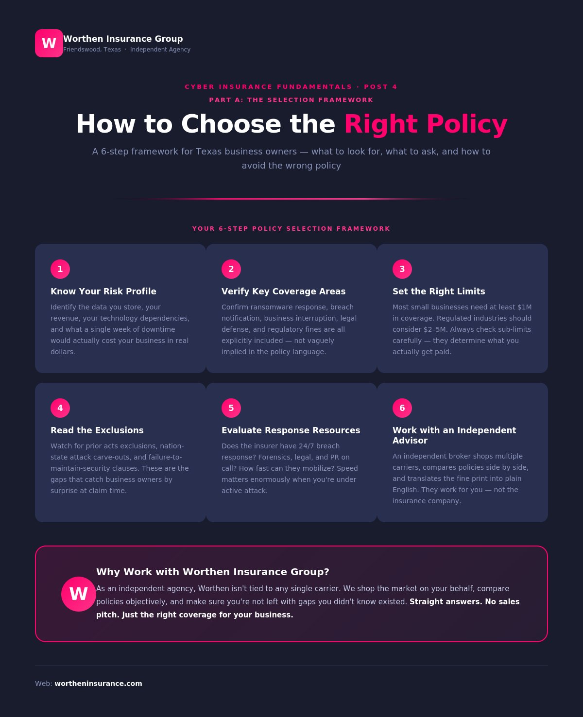 The cyber insurance market has dozens of carriers with dramatically different policy terms, exclusions, and pricing. An independent advisor — one who is not tied to a single carrier — shops the market on your behalf, compares policies side by side, and explains the fine print in plain language.